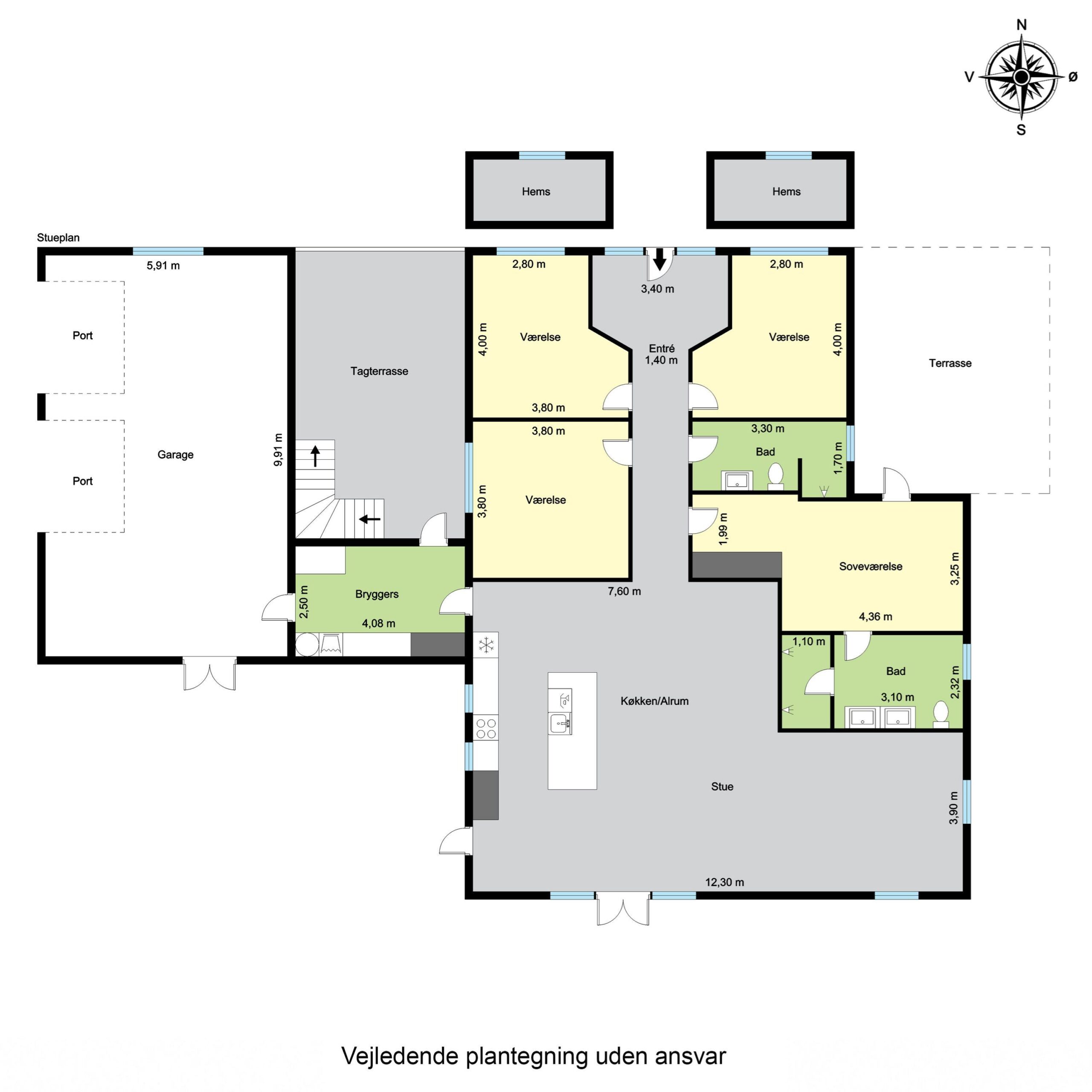 | Rum | 3 x værelser 2 x badeværelser 1 x soveværelse Køkkenalrum 50 m² TV afdeling 12 m² Garage 60 m² |